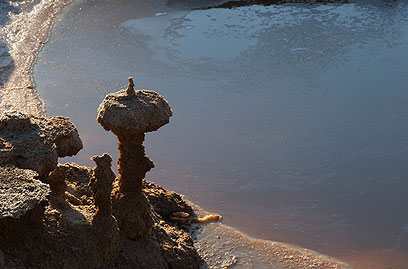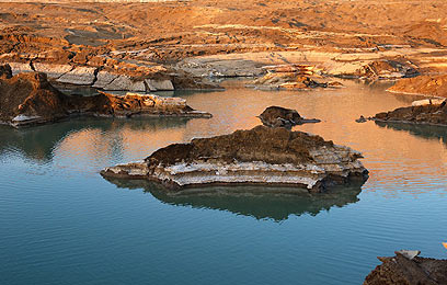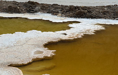 מצוקי מלח ובוץ מתפוררים אל תוך הים כתוצאה מירידת המפלס