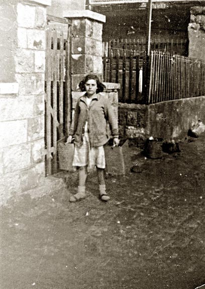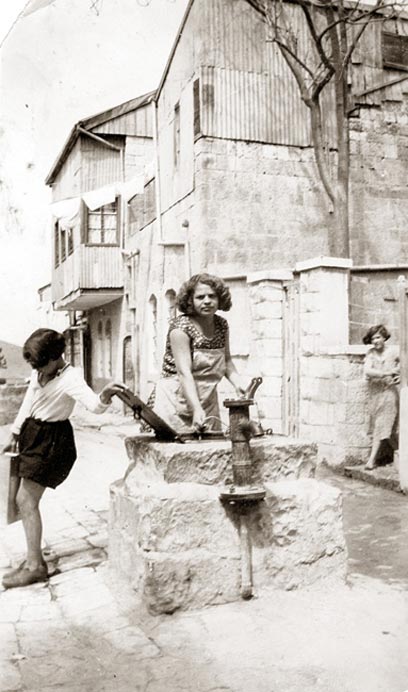 6. אסתר אלבוחר, אחותה של יהודית, ליד בור המים באוהל משה. עומדת בשער יוכבד בכר בת דודתה, 1930 לערך.