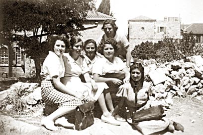 14. ירושלים בתקופת הלימודים בסמינר מזרחי להוראה , 1937 – 1941 יהודית אלבוחר מאחור עם חברות ללימודים.