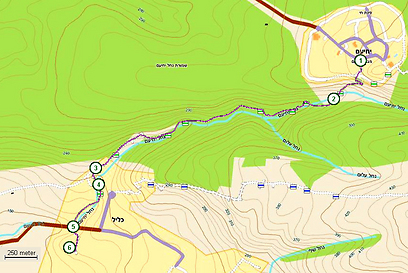 ממשיכים ללכת עם הסימון הירוק. אחד אחד, מציצים הבתים של היישוב המיוחד כליל שהשביל והנחל עוברים ביניהם. התושבים כאן הקימו כל אחד בחלקתו משק פרטי ומתקיימים מתוצר ידיהם ועמל כפיהם ומשתמשים באנרגיה סולארית. רבים מהתושבים עוסקים בחקלאות אורגנית, ללא שימוש בחומרים רעילים ומזהמים, וחלקם מגדלים צמחי בר לתיבול ולמאכל. במקביל ליציאה הרגלית מהיישוב, יכולים הנהגים להביא את המכוניות שנשארו בתחילת המסלול (1), ביחיעם, כ-20 דקות נסיעה לכל כיוון.
