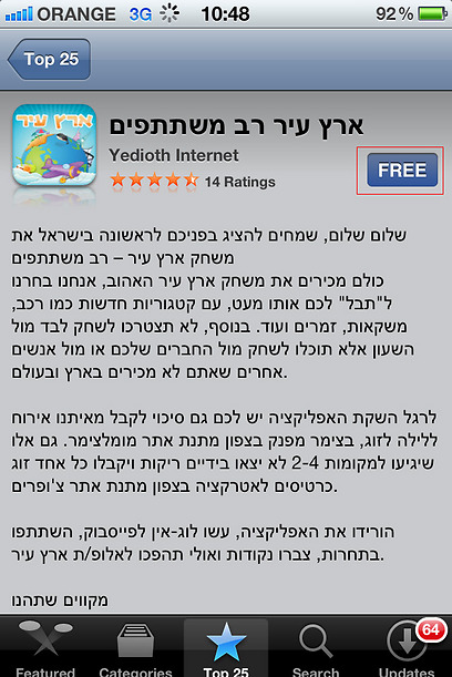 2. בחרו אפליקציה כלשהי בחינם (זה לא יעבוד אם לא תבחרו משהו בחינם) כמו "ארץ עיר רב משתתפים". גללו קצת למטה, תראו בצד ימין אזור של האפליקציות המובילות בחינם.