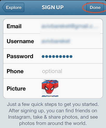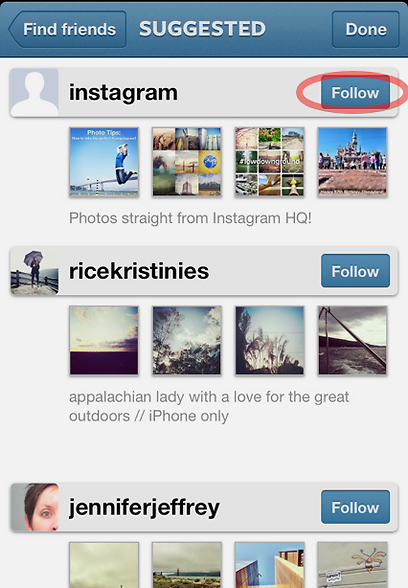 בשלב האחרון אינסטגרם תציע לכם כמה חברים נוספים לעקוב אחריהם, לפי רשימת ההמלצות של הרשת. לא מדובר באנשים שאתם מכירים אישית, אלא בצלמים פעילים ובולטים במיוחד שמשתמשים באפליקציה. קליק על Follow אם אתם מעוניינים (מסומן בעיגול), וכשתסיימו לחצו על Done. מזל טוב, יש לכם חשבון פעיל באינסטגרם.