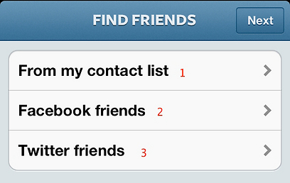 אינסטגרם תציע לכם להוסיף חברים. הדרך הפשוטה ביותר לעשות זאת היא אוטומטית - פשוט בקשו מהאפליקציה לחפש חברים בספר הטלפונים שלכם (1), בפייסבוק (2) או בטוויטר (3) - אפשר גם וגם וגם.