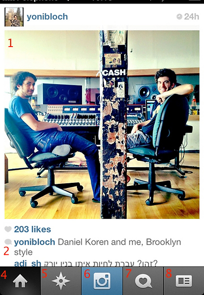 את רוב המסך יתפסו, כדרך הטבע, התמונות (1). במסך שלמעלה אנחנו צופים בתמונה שהעלה המוזיקאי יוני בלוך, שם המשתמש שהעלה את היצירה תמיד יופיע מעל התמונה. מתחת לכל תמונה (2) תמצאו את רשימת המשתמשים שעשו לייק, כמו גם תגובות, אם יש כמובן. כשתגללו את המסך למטה תגלו עוד ועוד תמונות. החלק התחתון של המסך מוקדש לאייקונים המובילים לחלקים האחרים באפליקציה: הבית (4) הוא מסך הבית בו אתם נמצאים. המצפן (5) יוביל אתכם למעין עמוד המלצות, שמציג את התמונות החמות ביותר באינסטגרם, וגם מאפשר לכם לבצע חיפושים אחרי נושאים או צלמים מסויימים. הכפתור האמצעי והכחול (6) הוא החשוב ביותר - כי הוא מוביל אתכם היישר למצלמה, שתאפשר לכם לצלם ולהעלות את התמונות שלכם לשירות. עוד רגע נגיע אליו, אבל לפני זה יש לנו שני אייקונים אחרונים: הבלון הקטן עם הלב (7) מרכז את כל העדכונים שקשורים ישירות אליכם - שם תוכלו לראות מי עשה לכם לייקים, האם יש לכם עוקבים חדשים וכדומה. האייקון האחרון (8) יוביל אתכם ל"פרופיל" שלכם, בו תוכלו לראות את כל התמונות שהעלתם וגם לגשת להגדרות המתקדמות של האפליקציה. אחרי שאנחנו יודעים את זה - הגיע הזמן להגיע לתכל'ס.