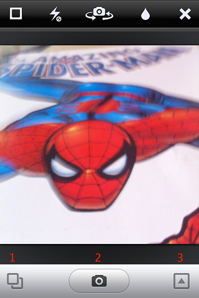 רוב המסך מוקדש ל"עינית" עצמה (איפה שספיידר-מן), עם מספר כפתורים שמפוזרים מעליה ומתחתיה בשלב זה נתמקד רק בשורת הכפתורים התחתונה: בשביל לצלם תמונה פשוט לחצו על כפתור המצלמה האמצעי (2). אם כבר יש לכם תמונה שצילמתם במצלמה המובנית של הסמארטפון שלכם, תוכלו ללחוץ על הכפתור השמאלי (1) כדי לבחור תמונות מתוך הספרייה שלכם, אותן תוכלו לשלוח במהירות גם לאינסטגרם. הכפתור הימני (3) יאפשר לכם להוסיף אפקטים מיוחדים לתמונות שלכם - עוד עליו בהמשך.