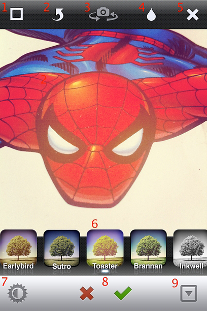 6. שורת האפקטים - כל "כפתור" יצור אפקט נוסטלגי על התמונות שלכם, שמדמה צילומים ישנים. במקרה שלנו, ספיידר-מן נראה קצת שרוף בכלל שהאפקט שבחרתי הוא אפקט הטוסטר. ניתן להחליף אפקטים כמה פעמים שרוצים (עד השמירה הסופית), ולכן הרגישו חופשיים להתנסות עד שתמצאו אפקט שמוצא חן בעיניכם. שימו לב שניתן לגלול את השורה ימינה ושמאלה כדי לחשוף אפקטים נוספים.