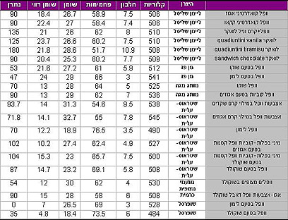 בשני המוצרים נמצאה הכמות הגבוהה ביותר של שומן, מבין כל המוצרים שנבדקו בקטגוריה זו (31.3-32.7 גרם/100 גרם). כמות הקלוריות הייתה אף היא גבוהה, כאשר בטעם האגוזים כמות הקלוריות הייתה הגבוהה ביותר מבין כל המוצרים שנבדקו (545 קק"ל/100 גרם). בשני המוצרים כמות השומן הרווי הייתה בינונית (14 גרם/100 גרם). בשל ערכי השומן הגבוהים המוצרים אינם מומלצים מבחינה תזונתית.