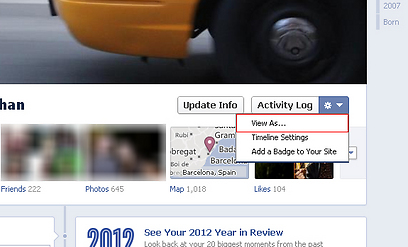 כדי לראות כמישהו אחר, גשו לטיימליין שלכם, מתחת לתמונת ה-Cover תראו גלגל שיניים, לחצו עליו > View As.