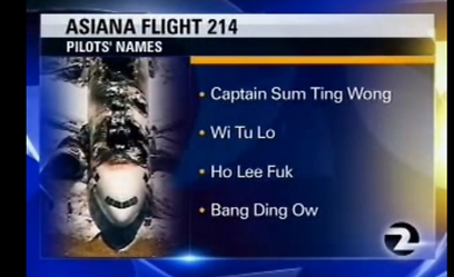 את השמות המשובשים קיבלה הרשת לטענתה לאחר שאושרו על ידי פקח טיסה מתלמד. לא ברור כמה אנשים עבר המידע הזה, אבל מה שידוע הוא שבסופו של דבר הקריאה קמפבל בשיא הרצינות שמות כמו Captain Sum Ting Wong וכן Wi Tu Lo, הנשמעים כמו "קפטן, משהו לא בסדר" ו"אנחנו נמוכים מדי". מכל הרשת, היא וודאי זו שהכי רוצה, שאנשים נוספים לא ייפגעו מצפייה בסרטון ביוטיוב.