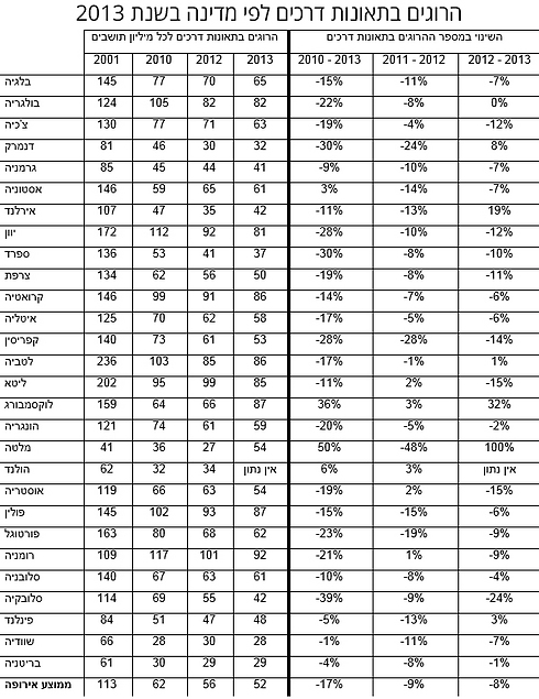 הנתונים מתייחסים למספר ההרוגים בתאונות דרכים לכל מיליון תושבים. המספר הנמוך ביותר נרשם בשוודיה, שם נהרגו 28 בני אדם בתאונות לכל מיליון תושבים. בבריטניה עומד המספר על 29, בדנמרק על 32 בממוצע ובספרד על 37. בישראל מספר ההרוגים בשנת 2013 עמד על 38 לכל מיליון תושבים - זאת למרות עלייה במספר ההרוגים בהשוואה לשיא החיובי שנרשם בשנת 2012.
