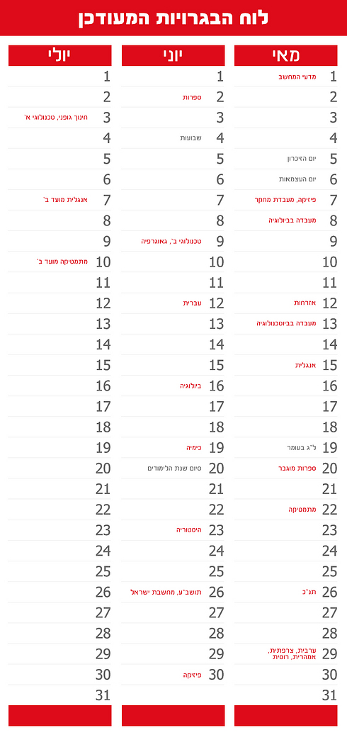 בפעם השלישית השנה עדכן משרד החינוך את לוח תאריכי בחינות הבגרות בעקבות תלונות שהעלו תלמידים ומורים - בעיקר על רקע צפיפות וחפיפה בין מועדי הבחינות. לראשונה פורסם לוח הבגרויות באוגוסט שעבר, אולם פניות של תלמידים הביאו להורדתו מאתר המשרד. לפני כחודשיים פורסם לוח חדש אולם גם הוא גרר תלונות מהשטח, ואתמול (ד') פורסמה "הגרסה הסופית בהחלט" של מועדי הבגרויות.
