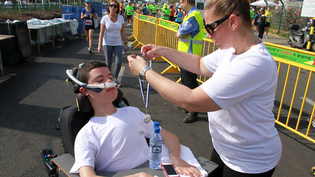 אמו של שגיא מעניקה לו מדליה בסוף מירוץ. צילום: עמותת צעדים קטנים