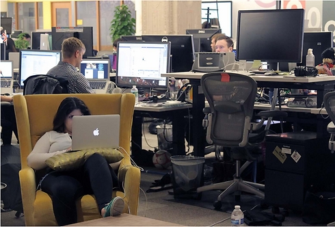 התקרה חשופה, עמוסה בנורות, צינורות וחוטים. במשרד פזורות מאות עמדות עבודה וכיוון שכל אחת מצויידת בשולחן מתכוונן; תמיד חלק מהעובדים יושבים וחלק עומדים. לא צריך להביא אוכל מהבית כי יש שף. כך נראים משרדי פייסבוק החדשים בניו יורק