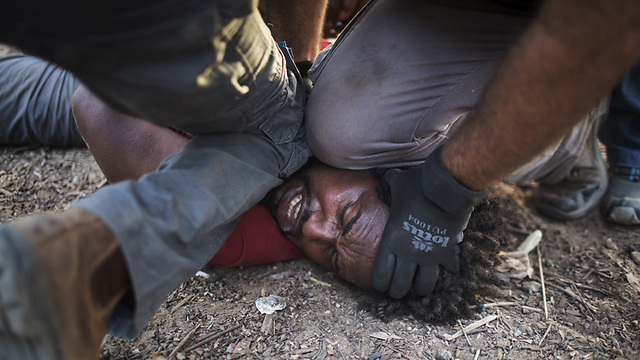 פקחי רשות ההגירה עוצרים בכוח מבקש מקלט במהלך הפגנה.ליד גבול מצרים, 29.6.2014. צילום: אורן זיו