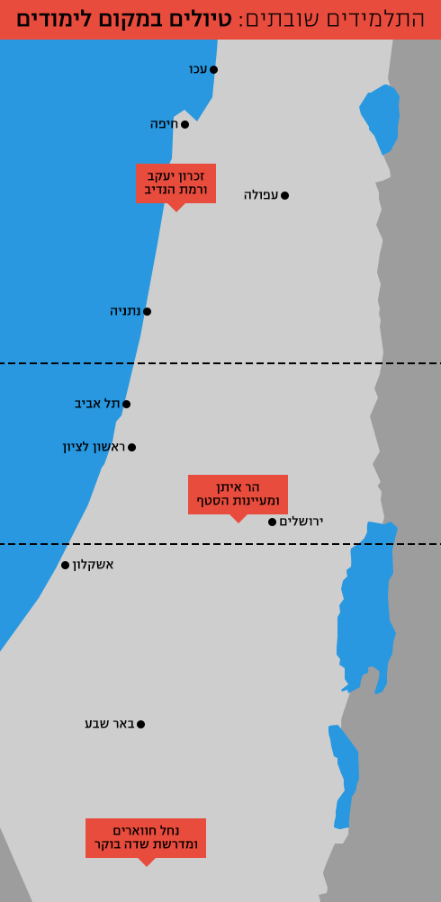 אחרי שארגון המורים החליט להפסיק ללוות את הטיולים השנתיים החליטו התלמידים לשבות מחר - ולצאת עצמאית לטיולים בשלושה מוקדים. "זה המוצא האחרון", אמרו. מועצת התלמידים: אם לא יהיה פתרון - נשבות גם בחמישי ושישי