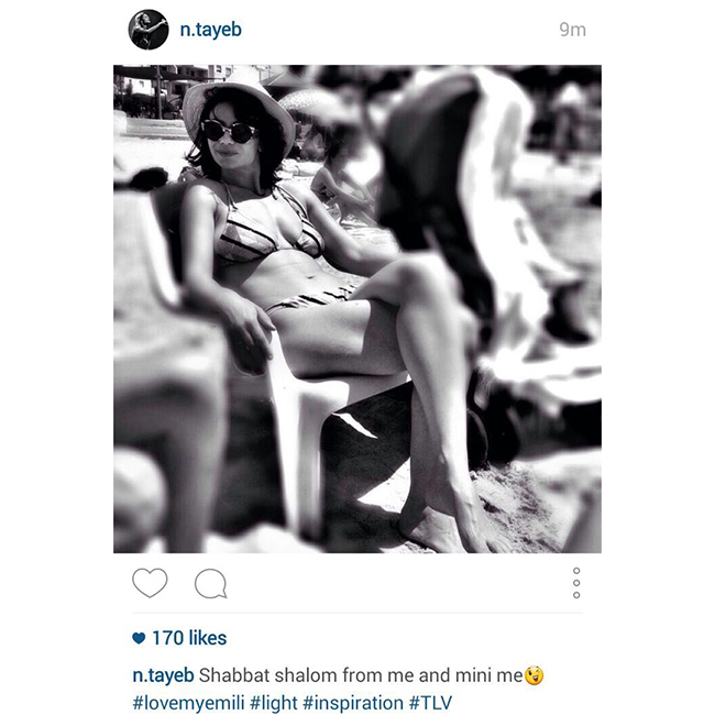 עשרה חודשים אחרי שתועדה בפעם הראשונה בתולדותיה בביקיני בים, כשהיא בהריון מתקדם ועם בטן שלא ניתן לטעות בה, חזרה טייב לחופי הים של תל אביב, הפעם, כשהיא מספקת את התיעוד בעצמה. כשהיא שרועה בכיף שלה, על כסא נוח ביום שמשי, ולצידה מטושטשת (במכוון, כמובן) אמיליה בת החצי שנה שמסתלבטת בעגלה, טייב העלתה תמונה לאינסטגרם וכתבה "שבת שלום ממני וממיני מי". במילות התיוג באנגלית היא כתבה: אוהבת את אמילי, אור והשראה. אנחנו היינו מוסיפים מילף ויוםלוהטבמיוחד.