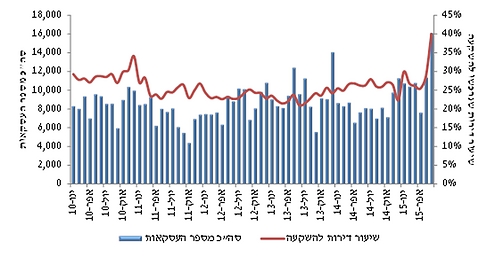 בתוך כך, ביום חמישי האחרון פרסמה הלשכה המרכזית לסטטיסטיקה (הלמ"ס) כי בחודש יוני נמכרו בישראל 3,096 דירות חדשות - עלייה של 13% לעומת חודש מאי וזינוק חד של 79% לעומת חודש יוני 2014. בנוסף, נבנו 1,535 דירות שלא למטרות מכירה (בנייה עצמית, בנייה לצורכי השכרה, ובנייה במסגרת קבוצת רכישה). מדובר בירידה של 19% לעומת חודש מאי ועלייה של 14% לעומת חודש יוני 2014.