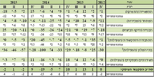 בענף הבנייה, לעומת זאת, הזינוק בהיקף הפעילות משתקפת הן בבניית מבנים והן בבניית תשתיות. הפעילות המוגברת ממשיכה להיות מלווה במגבלות חמורות הנובעות ממחירי הקרקעות וממחסור בעובדים מקצועיים. הציפיות הן להתרחבות נוספת בפעילות ברבעון הבא.העלייה בענף בתי המלון, לפי הדו"ח, משקפת את התאוששות הענף ביחס לתקופת מבצע "צוק איתן". העלייה נובעת מגידול במספר הלינות של ישראלים לצד אי שינוי במספר הלינות של תיירים. מחברי הדו"ח מציינים, כי הציפיות הן לחזרה למגמת הירידה בהזמנות תיירים ברבעון הבא.