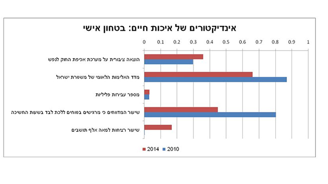 בתחום הביטחון האישי חלה הידרדרות מ-2010 אז דורגה ישראל במקום ה-6 ל-2014, אז ירדה ישראל למקום ה-17 בקרב מדינות ה-OECD. בתחום זה חלה הידרדרות מ-2010, אז שיעור המדווחים על הביטחון ללכת לבד ברחובות בחשיכה עמד על 80%, ואילו ב-2014 עמד על 45% בלבד.