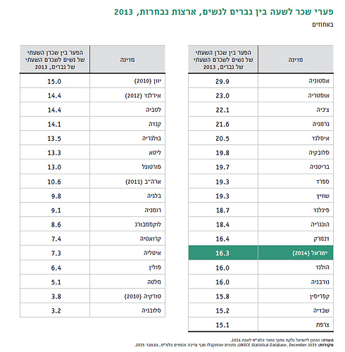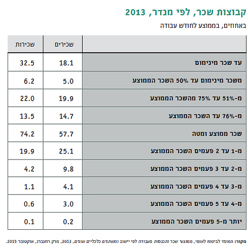 בבחינת הדרגים הנמוכים של סולם השכר מצוין, כי פערי השכר בן גברים לנשים שומרים על יציבות, כאשר בשנת 2013, 74.2% מהשכירות השתכרו שכר ממוצע ומטה, בהשוואה ל-57.7% מהשכירים. שכרם של שכירים ערבים היה נמוך ב-29% מהשכר הממוצע ב-2014 ושכרם הממוצע של שכירים אשכנזים גבוה מהממוצע ב-38% בעוד ששכרם של מזרחים ב-12% בלבד.