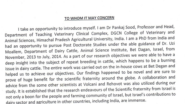 מכתב נוסף התקבל מצידו של פרופ' פאנקאש סוד מהודו, מנהל המתחם הקליני ללימוד וטרינריה במוסד DGCN לוטרינריה ומדעי בעלי החיים באוניברסיטת Himachal Pradesh. "יש לי ניסיון עשיר עם חוקרים מישראל ומהמכון הוולקני", הוא כתב. "עשיתי את הפוסט-דוקטורט שלי אצל ד"ר עוזי מועלם מהמכון ומאז עשיתי איתו שיתופי פעולה פורים. שקלתי שיתוף פעולה בינלאומי עם חוקרים מובילים בתחום בעלי החים בישראל, אבל גיליתי שהמכון הוולקני עובר לצפון.