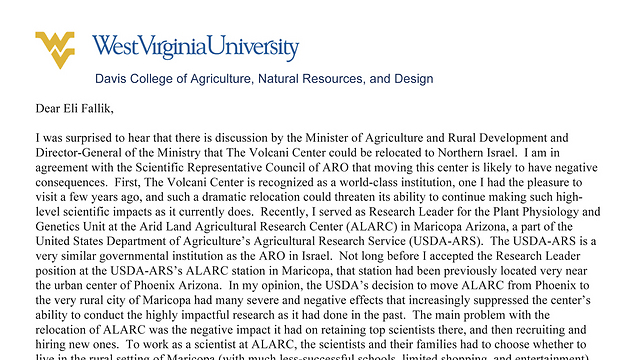 במכתב ששלח פרופ' מאט ג'נקס, מנהל מחלקת מדעי הצמח והקרקע בבית הספר לחקלאות ומזון, דייויס קולג', של אוניברסיטת ווסט וירג'יניה, צוין: "הופתעתי לשמוע על הדיון מצד שר החקלאות על העברת המכון הוולקני לצפון ישראל. אני סבור כי למהלך יהיו השלכות שליליות מבחינת היכולת להמשיך במחקר מדעי מוביל, שמירה על מדענים בכירים ועוד.