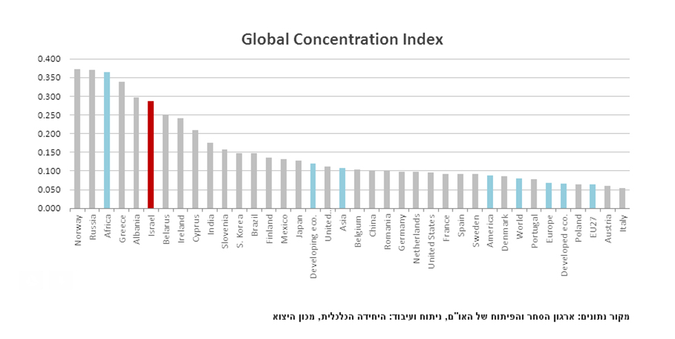 לפי הנתונים, רמת הריכוזיות בישראל בתחום היצוא נמצאת אחרי נורווגיה, רוסיה, יבשת אפריקה, יוון ואלבניה. מדד האו"ם מדרג את רמת הריכוזיות בין 0 ל-1, כש-1 הוא יצוא ריכוזי ו-0 הוא יצוא מבוזר. לפי נתונים אלה, בישראל היצוא הוא ריכוזי באופן חריג, והריכוזיות בו עומדת על 0.287 נקודות לעומת ממוצע הריכוזיות העולמי, שעומד על 0.079 נקודות.