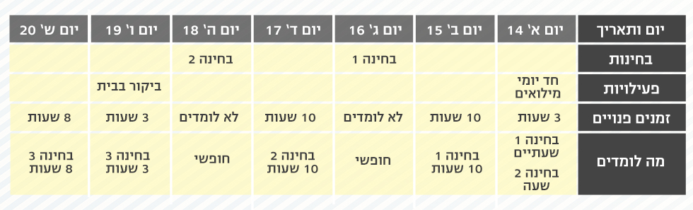 כיצד לנהל את הזמן? עם מה להתחיל קודם? איך אפשר לוודא שיש לנו מספיק זמן ללמוד לקראת כל בחינה? כדי לצלוח את התקופה העמוסה מבלי לפספס אף משימה - כדאי מאוד לתכנן מראש. איך עושים את זה? עובדים בשלבים