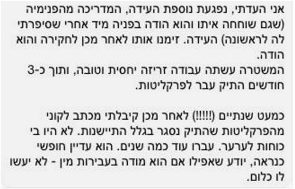 "חייבים לדעת, שבתיקי עבירות מין, אין דבר כזה חוסר עניין. אסור לסגור תיקים מחוסר עניין לציבור. ובכל-זאת, תיקי עבירות מין נסגרים מחוסר עניין לציבור. ואז, מה שקורה זו אחת משתי אופציות. לרוב, אין למתלוננים מושג שזה אסור וזה נשאר כך. ובמקרים שיש ומגישים ערר, זה לוקח בערך שנה". שני שטלריד, מסייעת לנפעי תקיפה מינית, משתפת