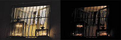 בתמונה מימין: צילום במקום חשוך עלול באופן טעי להסתיים בתמונה חשוכה אלא אם מגדירים רגישות גבוהה של החיישן (התמונה משמאל)