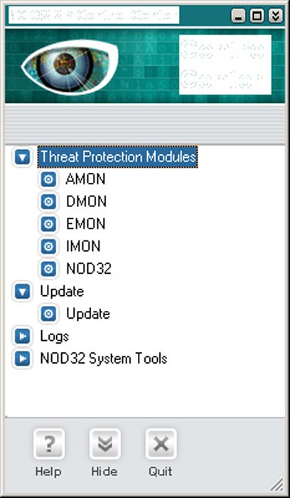 במסך התוכנה תתקלו בכמה אפשרויות, כאשר רוב השמות שלהן ידועים רק למי שמכיר את NOD32 – לשאר זה יראה כמו סינית בהתחלה. לחיצה על כל אחד מהם יפתח חלון נוסף ובו אפשרויות נוספות להגדרות מתקדמת יותר. AMON בודק שלא יעשו שינויים לא רצויים למערכת הקבצים שלכם, DMON מגן על מסמכים, EMON מגן על דואר אלקטרוני, IMON מגן על תנועה מהאינטרנט ו-NOD32 נותן אפשרויות סריקת וירוסים.