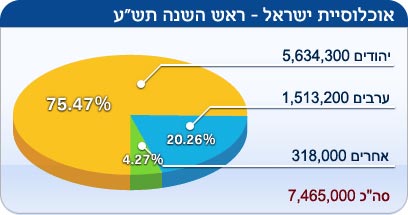 תמונת מצב - לקראת ראש השנה תש"ע: ישראל הולכת וגדלה. על-פי אומדן הלשכה המרכזית לסטטיסטיקה, עם סיומה של שנת תשס"ט, חיים בישראל כ-7.465 מיליון תושבים. כ-5.634 מיליון מהם יהודים (כ-75.47%), עוד כ‑1.513 מיליון ערבים (20.26%), והיתר, כ‑318 אלף (4.27%), מוגדרים "אחרים": אוכלוסייה הכוללת את כל מי שאינם מסווגים לפי לאום - רובם עולים ובני משפחותיהם שאינם רשומים כיהודים. הישראלים לא ממהרים לעמוד מתחת לחופה, וגם שרובנו מעדיפים את הצפיפות בגוש דן על המרחבים בגליל ובנגב.