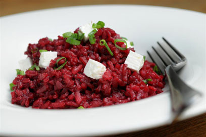 - מוסיפים עוד 1/3 ממיץ הסלק ומבשלים תוך כדי ערבוב עד שכל המיץ נספג באורז