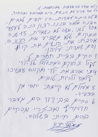"הכתב שלו מאוד איטי", מסבירה ירדני. "זה מראה על אדם עם בעיות רגשיות, מאוד קפדן ודקדקן, נוקשה". לדבריה, הכתב הגדול והשוליים הרחבים יחסית מצד שמאל אופייניים לאדם נרקסיסט, אנוכי, ולכך מצטרפת גם החתימה שלו: "הוא כותב 'גואלי רצון', ועושה קישוט מתחת לחתימה. בחתימה יש גם סימנים פאליים, כמו אבר מין גברי, שמתאימים לאדם שחושב רק על 'אני ואני ואני', ו'כל הבחורות מתות עליי', ומאוד חשוב לו להבליט את הגבריות שלו. מאוד חשוב לו שנשים ירדפו אחריו - זו מהות החתימה שלו. אנוכיות נרקסיסטיות צועקת מהכתב שלו בצורה שאי אפשר לתאר".