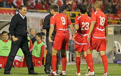 אלי גוטמן חוגג עם השחקנים באדום (עוז מועלם)
