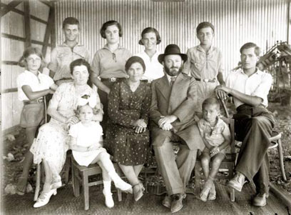 13. משפחת (בלוגרנד) כחולי במושב מרחביה. יצחק ואשתו ציפורה (בת הישוב היהודי הישן בצפת). משמאל, עומד הבן בנימין ולידו אחותו מרים שנישאה לאליק (יושב מימין) שהיה מנהל בית ספר בן-גוריון בעפולה