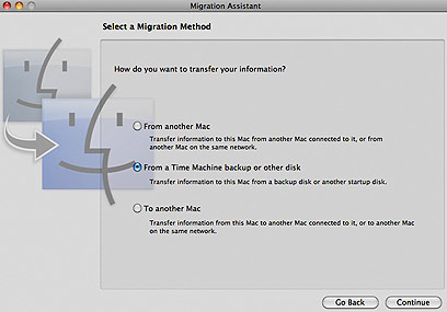 כעת הפעילו את Finder. מתוך תיקיית Applications בחרו ב-Utilities. בתוך Utilities בחרו ב-Migration Assistant. החלון שיפתח יציג לכם מספר אפשרויות - בחרו באפשרות הראשונה - From Another Mac. זוכרים את הגיבוי שהכנתם? חברו את הכונן החיצוני למחשב (אם הוא לא מחובר כבר) ולחצו על Continue. מערכת ההפעלה תעבור על כל המידע הנמצא בכונן הגיבוי ותשאל אתכם מה תרצו להעביר. אם בחרתם בהתקנה הנקייה ביותר וכרגע סיימתם להתקין את iLife, העבירו רק את המידע האישי שלכם. אל תתקינו שום תוכנות מחדש, ואל תעבירו שום מידע משתמש. סמנו את האפשרות להעברת התיקיות בהן אתם משתמשים בלבד. לרוב אלו יהיו תיקיית Documents וכל תיקייה ראשית גדולה אחרת בה אתם משתמשים. זמן: 60-120 דקות, תלוי בכמות המידע.