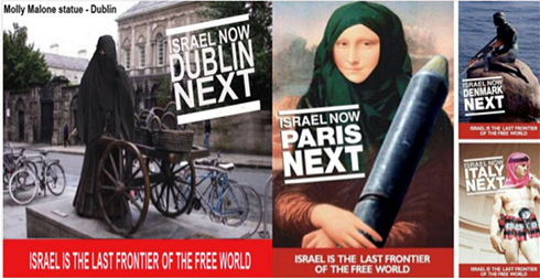 בתמונה אחרת נראה הפסל המפורסם של מיכלאנג'לו, דוד, עם כאפייה וחגורת נפץ, ולצדו הכיתוב "ישראל עכשיו, איטליה הבאה בתור". גם פסל בתולת הים בקופנהגן עבר עיבוד דומה - בידיה הוצב רובה - ואילו פסלה של מולי מלון בדבלין כוסה מכף רגל ועד ראש. מתחת לכל התמונות נכתב גם: "ישראל היא קו החזית האחרון של העולם החופשי". לפי הדיווח, התמונות עוררו תגובות נזעמות מגולשי טוויטר מיד עם פרסומן. "הרשויות באירלנד צריכות לדרוש מהשגריר הישראלי לדחות שנאה שכזו", הצהיר אחד מהם. גם אנדי סלוטר, חבר פרלמנט בריטי שפעיל למען פלסטינים, ציין כי "זה נראה גס, בלשון המעטה. התעמולה הישראלית איבדה כל תחושה של פרספקטיבה ויצאה מכלל שליטה".