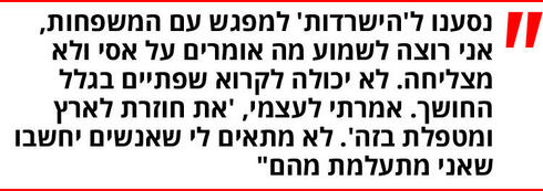 "עדי התפרקה. כשאסי חזר היא פשוט שיחררה בבת אחת כל מה שהיה עליה. הגוף הוא לא מכונה, אם קשה, הוא קורס. וכשאסי חזר העברתי לו את כל המטען של הילדים, הבית, התשלומים, את כל המשא. לא יכולתי להכיל את זה יותר".