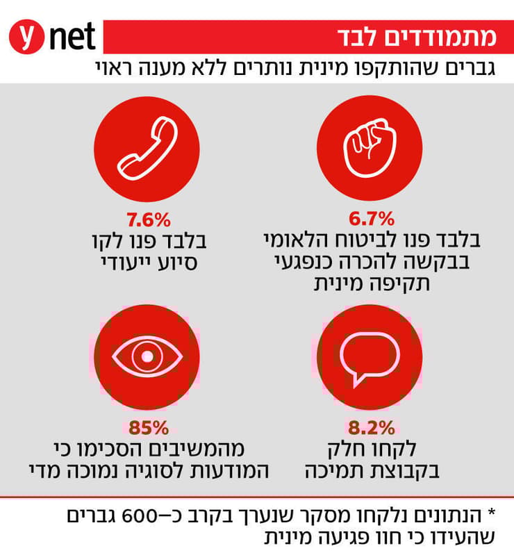 היעדר המענים אינו ייחודי לחוויה הפרטית של גיל. מחקר רחב היקף שנקרא "הבנת אלימות מינית נגד גברים וקידום מענים בתחום זה", ונערך בידי פרופ' עטרת גבירץ מידן, ראש המעבדה לחקר מיניות בבית הספר לעבודה סוציאלית באוניברסיטת חיפה, בשיתוף "הלובי למלחמה באלימות מינית" ובתמיכת מכון "חרוב", בקרב קרוב ל-600 גברים שעברו פגיעה מינית, מציג תמונה מטרידה בכל הנוגע למענים המוצעים לגברים שנפגעו. מעט מדי כתובות לפנות אליהן, ויותר מכך: מעט מדי מודעות והנגשה.