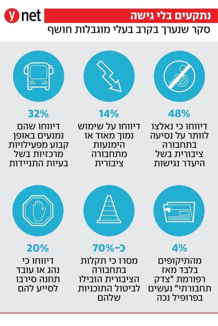 לפי ממצאי הסקר, שנערך בקרב 705 משתמשים בתחבורה הציבורית בישראל, כמעט מחצית (48%) מהאנשים עם מוגבלויות נאלצו לוותר על נסיעה. לצד זאת, 14% מהאנשים עם מוגבלות דיווחו על שימוש נמוך מאוד או הימנעות כמעט מוחלטת מתחבורה ציבורית - לעומת 4% בלבד בציבור הרחב.