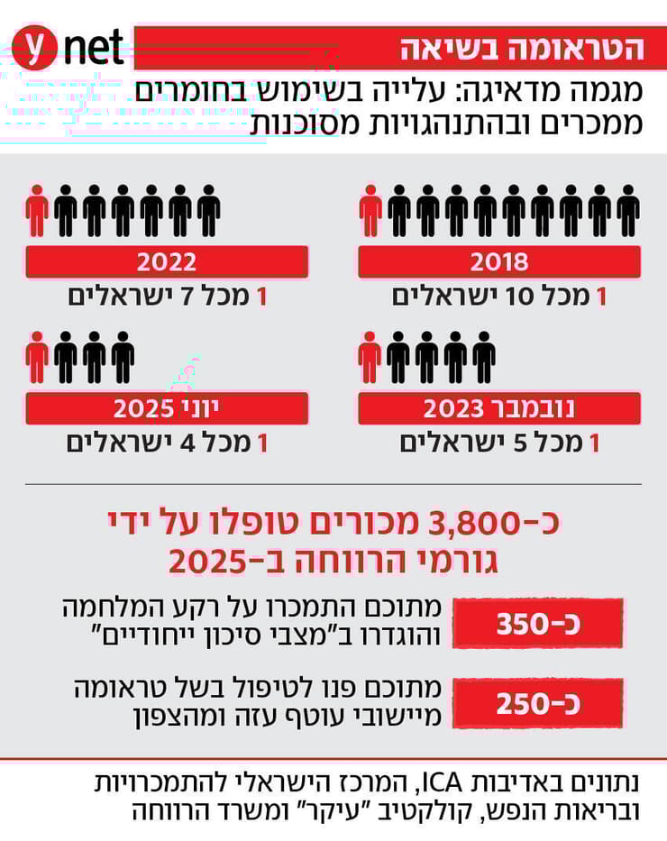 על פי ה"מרכז הישראלי להתמכרות" (ICA) ו"קולקטיב עיקר" (ICAR), מאז המלחמה נרשמה עלייה מדאיגה בשיעור הישראלים שמעידים על עצמם כי הם עושים שימוש בחומרים ממכרים - אחד מכל ארבעה, כלומר כמעט בכל בית בישראל.