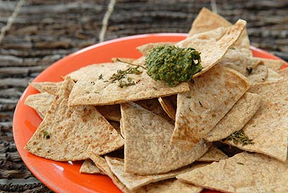 מתכון של נלי קרפנר. שתי דקות עבודה - ויש לכם נשנוש מדהים, שהולך נהדר עם פסטו, טפנד, סלסת עגבניות חריפה, ממרח שעועית לבנה, ממרח עדשים ועוד. מתכון זה מצריך חבילת טורטיות מקמח מלא, שניתן להשיג בחנויות מתמחות (כגון "ספייסס") ובמעדניות (כגון "דלישס") ובחנות המפעל של "טרס פזוס" (רח' המרכבה 73, א.ת. חולון, טל' 03-5597761).