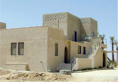 חוות האירוח של רודני הירש בקצה חולות חלוצה. בוץ, עץ וקש