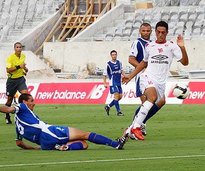 ערן זהבי מול יניב לביא. הפועל בכושר הבקעה מצויין (צילום: אלי אלגרט)
