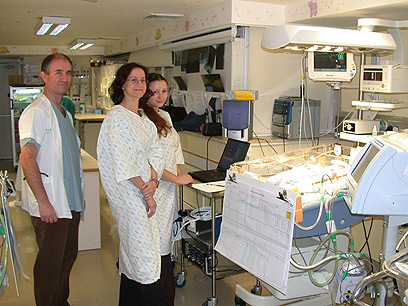 ד"ר דני וייסמן (משמאל), ד"ר כרמית לוי (במרכז) והמהנדסת אנה פיינגרש (מימין). ליד מיטתו של התינוק המונשם נמצאת מערכת הניטור החדשה (צילום: אלי דדון)