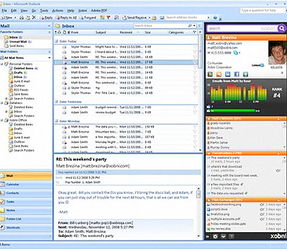התוסף Xobni, שמיקרוסופט כמעט קנתה, מתבל את ה-Outlook בחיפוש משופר, שרשור מיילים ושילוב עם Facebook ו-Skype. התוצאה בינונית למדי