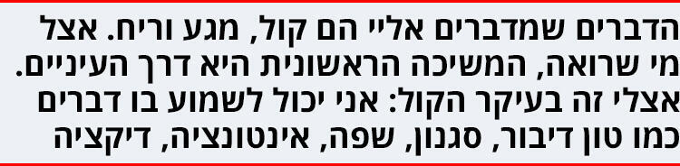 לא משנה לי איך בחורה נראית. הדברים שמדברים אליי הם קול, מגע וריח. אצל מי שרואה, המשיכה הראשונית היא דרך העיניים. הוא לא יתחיל עם מישהי שלא נראית לו. אצלי זה בעיקר הקול: אני יכול לשמוע בו דברים כמו טון דיבור, סגנון, שפה, אינטונציה, דיקציה.