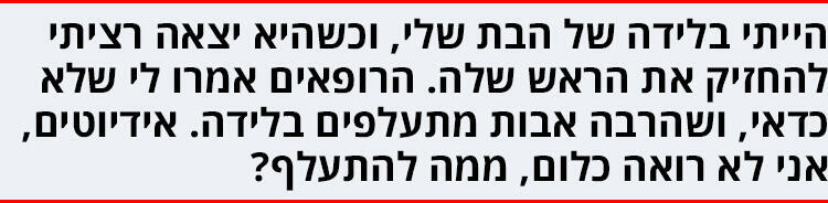 יש לי ילדה בת שנתיים. הייתי בלידה, וכשהיא יצאה רציתי להחזיק את הראש שלה. הרופאים אמרו לי שלא כדאי, ושהרבה אבות מתעלפים בלידה. אידיוטים, אני לא רואה כלום, ממה להתעלף? בכל מקרה, זאת אחת החוויות היותר מרגשות שהיו לי בחיים. חוויה של מגע, כמו כדור צמר רטוב כזה. יצאתי מחדר הלידה ורציתי לראות שוב את הבת שלי, מצאתי את חדר התינוקות ונכנסתי. החדר היה מלא צרחות של תינוקות. ביקשתי מהאחות שתראה לי איפה היא. התרגשתי כשנגעתי בה, למרות שבאותה מידה יכול להיות שהאחות שמה לי את היד על תינוק סיני.
