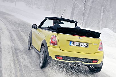 הריה המושלגים של דרום-אוסטריה אינם המקום האידיאלי להשיק מכונית קבריולה חדשה, אלא אם מדובר בניסיון של ב.מ.וו הגרמנית - בעלת הבית הרצינית בדרך-כלל של מיני - לפתח חוש הומור. ובכל זאת, גם האוויר הקר והשלג לא מצליחים לצנן את ההתלהבות מהגרסה הפתוחה שממתינה לי שם: אי אפשר שלא לאהוב אותה מיד, ולרצות לקפוץ אל מאחורי ההגה.לא הרבה השתנה בעיצוב לעומת הדגם הקודם - החרטום והישבן עודכנו קלות, ויש גם כמה חלקי מרכב חדשים, אבל צריך עין חדה במיוחד כדי למצוא את ההבדלים. וזה לגמרי מובן: המיני, בכל גרסאותיה, היא מכונית בעלת קסם ואופי אמיתיים, ונדמה שכל ניסיון לשנות או לעדכן את העיצוב רק ייגרעו מהקסם. הסיפור זהה בתא הנוסעים. השינויים אינם רבים, וטוב שכך: העיצוב מלהיב כתמיד, עם מד מהירות ענק במרכז, ומסביב שלל לחצנים ומתגים, הנראים כאילו נלקחו ממטוס קרב מתקופת מלחמת העולם השנייה.